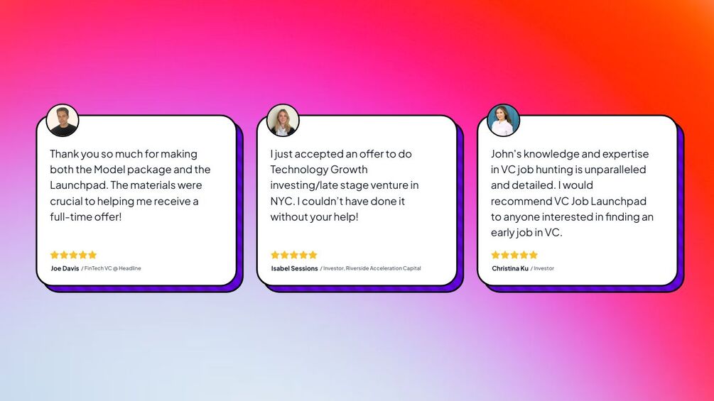 In VC Job Launchpad, you'll learn a proven framework for VC job search, based on my experience securing 3 VC job offers. Including: